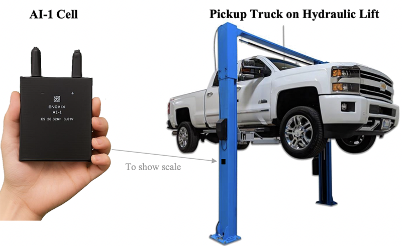 Figure 1. The first AI-1 cell is just 1.79 cu. in. in volume, yet it contains 26.3 watt-hours of electrical energy, enough to power a typical car lift to raise and lower a 4,948-pound truck to a working height of 4.7 ft — three times per charge.